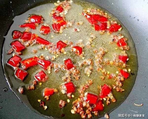 步驟七:另起鍋熱油,油熟後放入花椒炒出香味,然後關火,淋在幹辣椒、薑絲上面,即可食用。