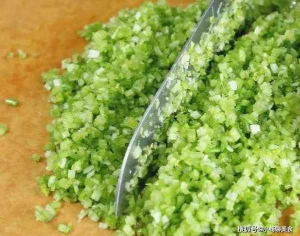 步驟三:鍋內添冷水,大火燒開,放入芹菜,把芹菜炒熟,撈出過冷水,瀝幹水分剁碎。