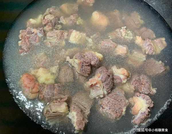 步驟三:鍋內添冷水,放入牛肉,大火燒開,倒入適量料酒。直到煮出浮沫和血水,撈出牛肉控水備用。