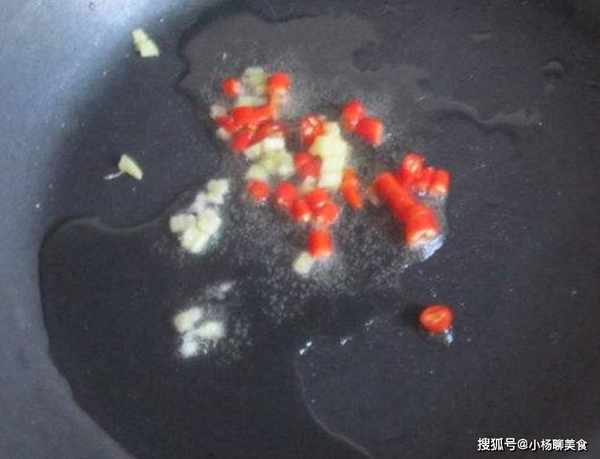 步驟三:起鍋熱油,油熟後放入葱絲、薑絲、幹辣椒,煸炒出香味。