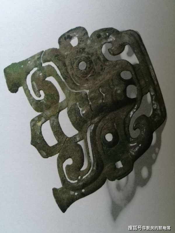 在眾多的藏品中,有一件器物看起來十分吸引人,該物正是青銅區的一件周代青銅面具。該面具為鏤空的獸面造型,頭上有兩支彎曲的角,眼睛圓睜呈怒狀,鼻口都頗為巨大,且在口中露出了獠牙。青銅面具整體造型看起來十分恐怖,猙獰之態盡被顯現出來,稱得上是真正的"青面獠牙"。