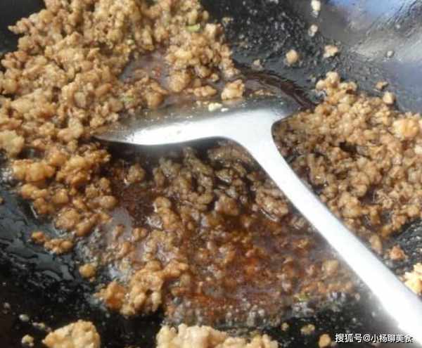 步驟五:倒入猪肉末,翻炒到猪肉末變色,倒入適量醬油炒勻上色。