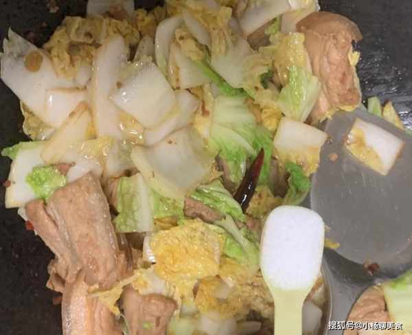 步驟五:然後倒入大白菜翻炒均勻,直到白菜開始變得軟塌,倒入適量清水。