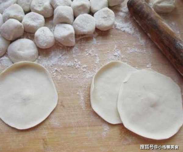 步驟七:切成小一點的劑子,擀成餃子皮,取適量餡放在皮中間,捏合捏緊,包成餃子。