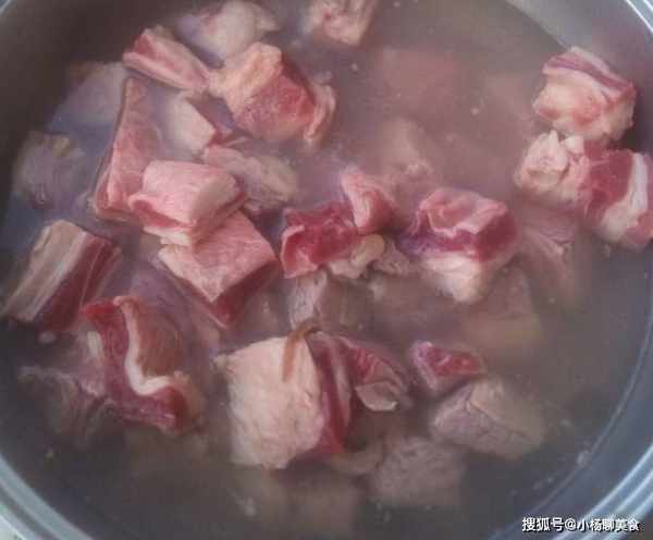 步驟一:牛肉沖洗乾淨,按照紋路切成塊,放入清水中浸泡15-20分鐘,撈出備用。