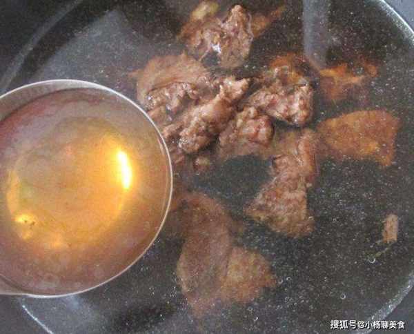 步驟五:繼續倒入牛肉,翻炒到牛肉變色,倒入適量醬油炒勻,然後倒入多一點的熱水。