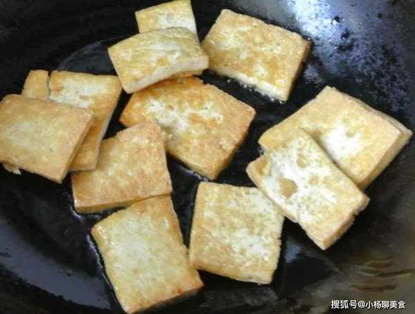 步驟三:起鍋熱油,油熟後放入豆腐,小火慢煎,直到豆腐呈現金黃色,盛出控油備用。