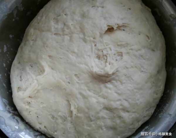 步驟二:然後往裡面倒入適量麵粉,攪成絮狀,揉成麵團,放在溫暖處,等到麵團發酵成原先的兩倍大。