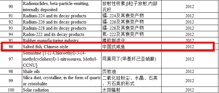 早在2020年,我國食藥總局就公佈了《世界衛生組織國際癌症研究機構致癌物清單》,其中的一類致癌物清單裏,編號為96就是鹹魚:
