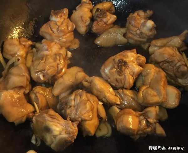 步驟五:然後倒入醃制好的雞塊,翻炒到雞塊呈現金黃色,倒入適量醬油炒勻。