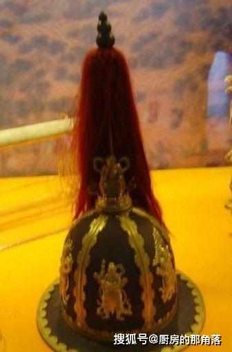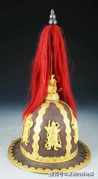 這是一頂鐵盔,分為六半。兩半之間的縫隙上,鑲嵌著金質的香子蘭紋,鍍金就很好理解了,高高的盔纓也不存在歧義,下麵,小編說的才是重點,在六瓣的鐵奎上,鑲嵌著金質的六甲神。
