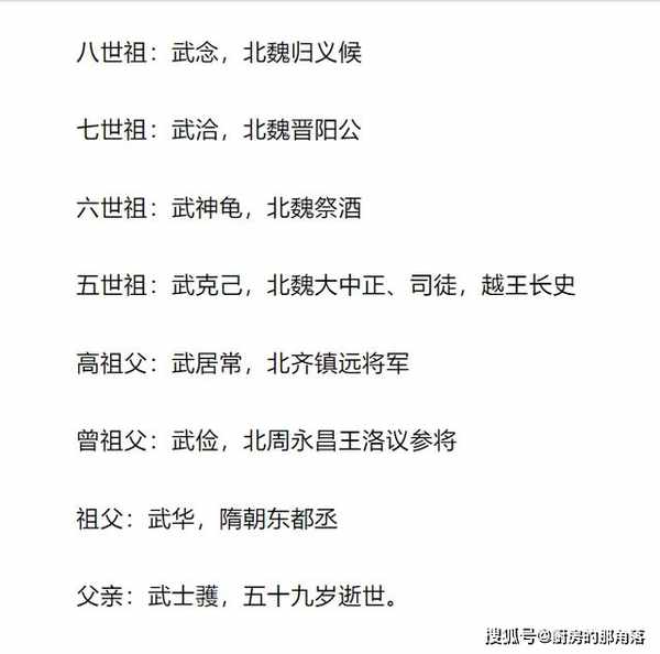 武則天的父親叫武士彠,根據已知的家譜,可以查到最早的一比特,是他的七世祖,叫武念,官至北魏時官至洛陽刺史,封歸義候。下一代,六世祖武洽,官至北魏時官至平北將軍、五兵尚書,封晋陽公。往下小編就不一一列舉了,直接跳到武士彠的父親武華,在隋朝時官至東都丞。