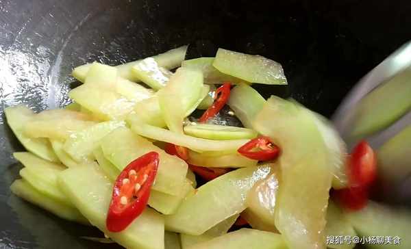 第二步:然後青紅辣椒洗乾淨切絲;大蒜切片,小米辣切圈;鍋燒熱,倒入適量的油,油熱之後下入蒜片和小米辣炒香,然後倒入西瓜皮爆炒,加入青紅辣椒絲翻炒至斷生,加入食鹽和雞精調味,炒勻即可出鍋。