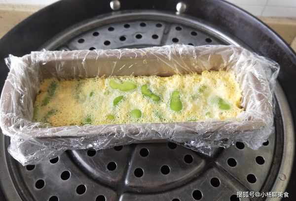 第二步:準備一個模具,將雞蛋蠶豆米液倒入模具中,蓋上一層保鮮膜,凉水上鍋蒸,大火蒸15分鐘,關火燜3分鐘就可以出鍋了,然後切成片狀就可以開吃了。
