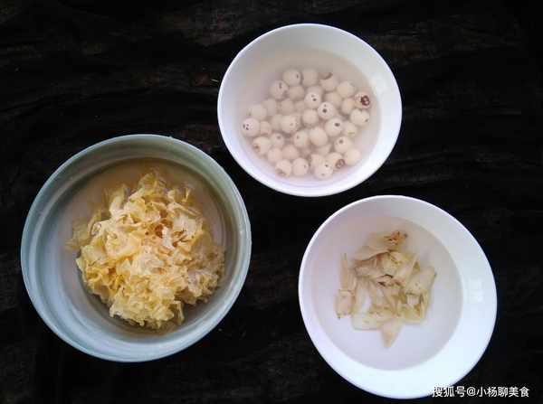 第一步:銀耳提前用凉水泡發,泡發好的銀耳去除黃色根蒂,撕成小朵;蓮子和百合也提前浸泡半個小時,蓮子去除內芯。