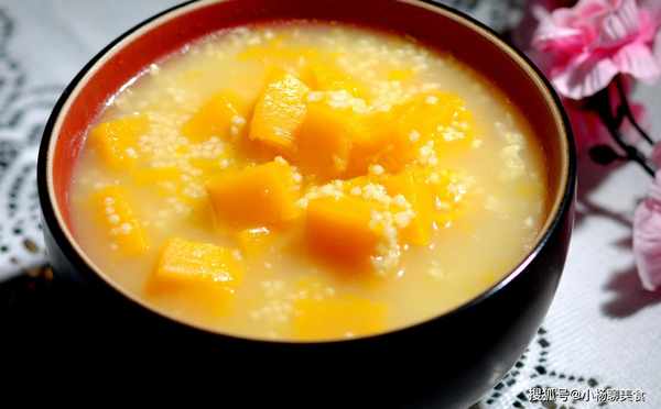 第二步:鍋中燒開適量的水,泡好的小米開水下鍋煮,水一定要一次性加足,中途不要再加水,然後大火將水再次燒開之後轉小火,滴上2滴食用油,蓋上鍋蓋慢煮30分鐘左右,直到湯變得粘稠,然後加入南瓜塊,繼續熬煮10分鐘,關火燜5分鐘即可。