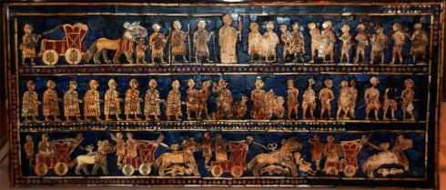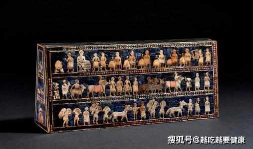 在諸多珍貴的文物中,有一件文物被放在大英博物館中展覽,它被命名為"烏爾軍旗",據納德先生的記錄,這件文物是他在烏爾的一個大陵墓中發現的,不過它其實並非一面旗幟,而是一個長度為40釐米,寬度為18釐米的盒子,盒子為木製品,但它之所以成為一件珍寶,就在於盒子兩面,是兩塊鑲飾板,全是用貝殼、閃綠石、粉紅色的次寶石等,鑲拼在瀝青為底的板上,形成了馬賽克式的獨特藝術。