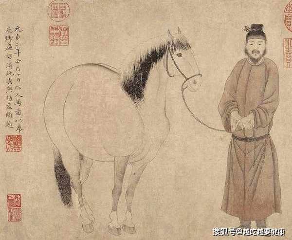 趙雍畫的馬,更是拘謹,那個養馬的奚官應該是一個元人,他臉上的神情惶恐,很有一種擔心樹葉掉下來,砸中腦袋的猥瑣形象。而奚官牽著的馬韁繩,已經下垂成了一個U字形,小編懷疑,奚官就是鬆開了韁繩,那匹溫順的馬,也不會撒開四蹄飛奔了。