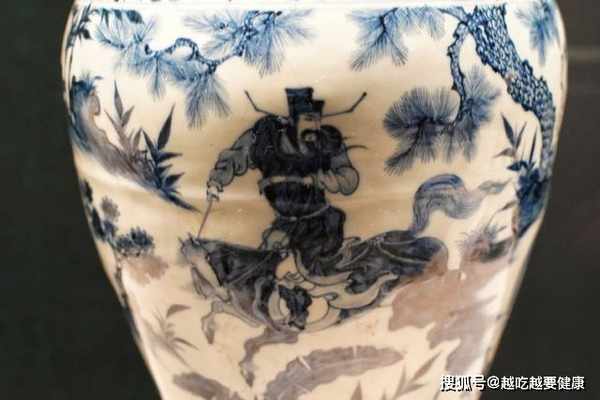 在梅瓶的肩部,我們可以看到"蕭何月下追韓信"的故事,以松、竹、梅、芭蕉、山石為背景,形象生動地展開一幅歷史畫卷,為後人研究當時的歷史提供借鑒資料。通過對比,"元青花蕭何月下追韓信圖梅瓶"比"元青花鬼穀下山圖罐"製作更加精美,專家們認為價值不可估量。