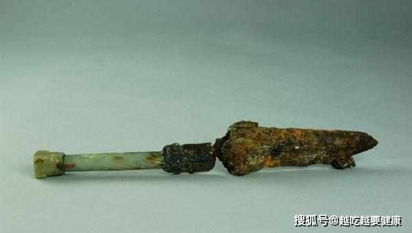 這件玉柄鐵劍,身長20釐米,莖長13釐米;柄為玉,刃為鐵,雖然劍刃已經被氧化的鏽跡斑斑,成了一坨"爛鐵",但是玉柄卻在時間的考驗下依然溫潤如初,細膩光滑;仔細看這玉柄,青中泛白,還帶些黃褐色的斑點線條;柄首還雕刻有四瓣花萼,十分的精美,不禁的讓人讚歎當時工匠高超的技藝。由於年代久遠,劍與牛皮鞘已經黏在一起,為了保護文物不受到二次傷害,就沒有强行將其剝離;經過專家鑒定,玉是青田玉,鐵中含有碳鋼以及銅芯,整個就是鐵,玉兩者最完美的結合,被譽為是"中華第一劍",那麼它究竟厲害在哪裡呢?