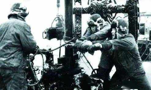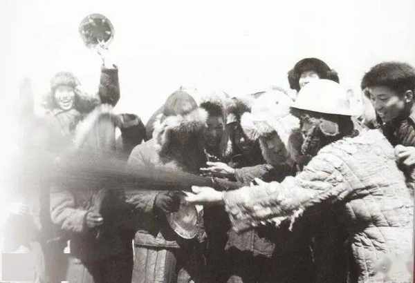 1963年大慶油田建成,石油工人在對一口油井進行試噴。