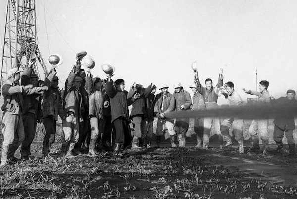 1959年9月26日松基三井噴油,在場的人們歡呼雀躍。