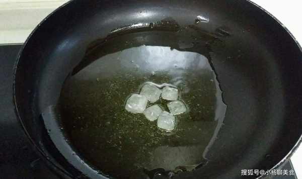 這種狀態下油還是冷的,用勺子慢慢的翻動冰糖,讓冰糖能够快速融化,大家要注意絕對不能够在熱油的時候下鍋,熱油下鍋有可能會讓炒出來的糖色有一股焦苦的味道,也有可能會讓食用油飛濺出來,讓自己受傷。