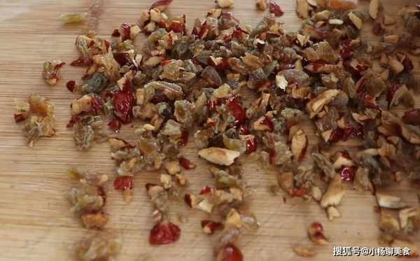 大米炸好後,然後再準備一些土豆和乾果,把土豆放進鍋裏炸脆後撈出來,然後把土豆和乾果剁碎,再準備一些葡萄乾和蔓越莓幹,然後把果乾切碎後放進堅果碎裏攪拌均勻。