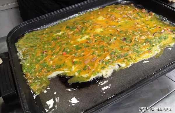 首先把60個雞蛋打在一個大盆裏,然後再把香葱切成蔥花,胡蘿蔔切成細絲,洋葱切粒,火腿腸切粒,把所有切好的食材一起放進盆裏,加鹽攪拌均勻,就跟平時煎雞蛋餅時的配料差不多,雞蛋攪拌均勻後,然後再往方形的煎鍋裏倒入適量的油,油熱後再把攪拌均勻的雞蛋舀進鍋裏,不能全部倒進鍋裏,否則雞蛋多了會煎不熟。