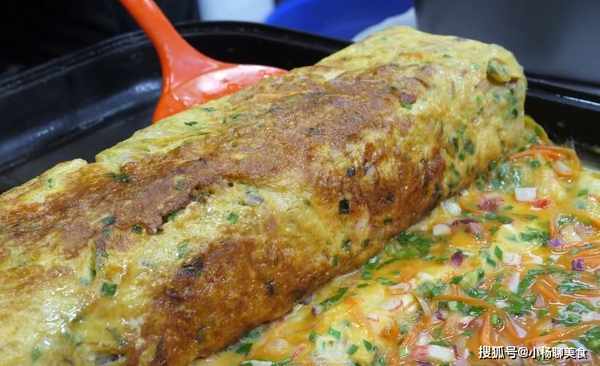 這樣煎的雞蛋餅,不但外面香脆,裡面也香脆可口,也不會因為雞蛋倒入太多而煎不熟,小攤老闆把煎好的雞蛋餅從鍋裏撈出來,然後再把雞蛋餅切成一片一片的,一份一片,來買的顧客也非常多,看著也非常好吃。