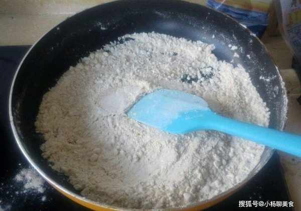 接下來就開始炒麵粉了,準備好一個不粘鍋,鍋燒熱後,把準備好的麵粉倒進鍋裏,然後用鍋鏟不停地翻炒,在炒制的過程中,用小火即可,以免很容易煎糊掉,麵粉煎至成駝色後,可以加入適量的芝麻油翻炒均勻。