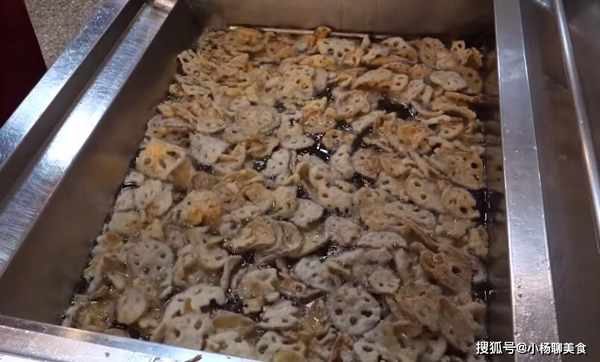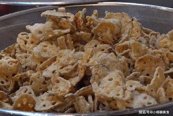 大哥把烘乾後的蓮藕幹裝進盆子裏,油鍋裏的油燒熱後,把蓮藕幹倒進油鍋裏炸,炸至表面金黃後撈出來,撈出來瀝幹油即可,小吃就做好了,撒上辣椒面就可以吃了,除了辣椒面,還可以放入番茄醬等醬料。