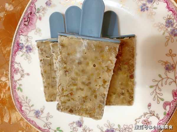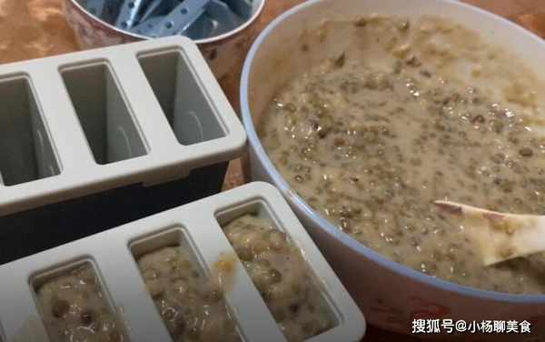 鍋裏的綠豆放凉後,撈出來裝進碗裏,再準備好雪糕模具,把放凉的綠豆舀進盒子裏,再把雪糕棍插在上面,放進冰柜裏,冰凍6個小時就可以拿出來了,脫模的時候,用溫水泡上30秒,然後雪糕就輕鬆脫模了,老公吃了兩支後說,這個雪糕全是豆子,吃了就飽了,都不用再煮晚飯了,又解渴又填飽肚子,味道沒有在外面買的綠豆冰糕甜,但味道還是不錯,大家在做的時候,可以用料理機把綠豆打碎,可以加適量的清水,這樣就不會因為吃雪糕而吃撐了。
