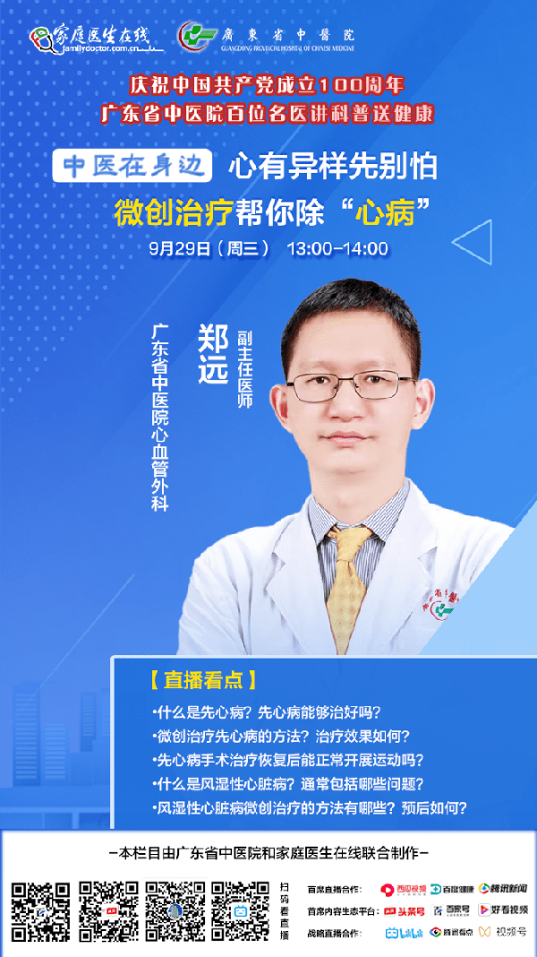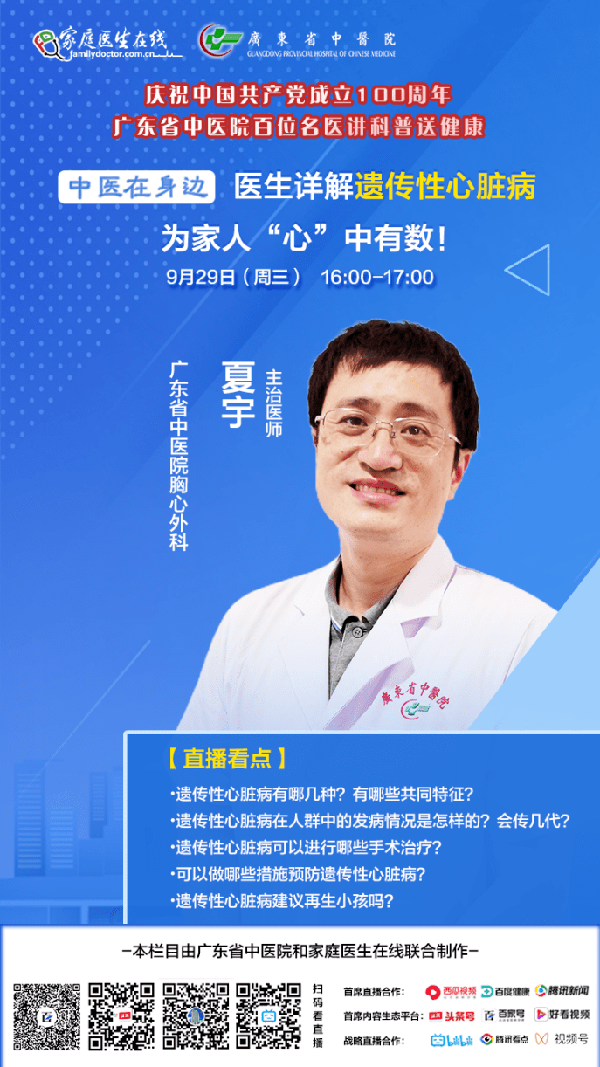 正值世界心臟病日之際,廣東省中醫院聯合家庭醫生線上推出心臟病日專場直播活動,邀請了廣東省中醫院心血管科主任醫師範小平、胸心外科主任醫師胡佳心、心血管外科副主任醫師鄭遠和胸心外科主治醫師夏宇,在9月29日從上午10:00開始,連續4場直播,為大家科普動脈瘤、心臟病微創治療、心臟病大血管疾病和遺傳性心血管疾病的相關知識,歡迎大家準時收看!