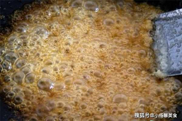 排骨醃好以後,拿出來控幹水,起鍋燒油,油溫8成熱先把排骨炸一遍,用少量油就可以,勤給排骨翻身,炸到表面金黃,撈出瀝幹油,接下來才是炒糖色。對於新手來說,可能炒糖色是非常困難的,不容易掌握,炒不好就炒糊了,有苦味。今天教大家一個容易掌握的炒糖色技巧---水炒糖色。