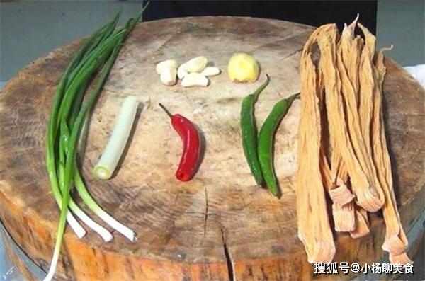 首先準備食材:幹腐竹,小葱,大葱,大蒜,生薑,紅辣椒,青椒。