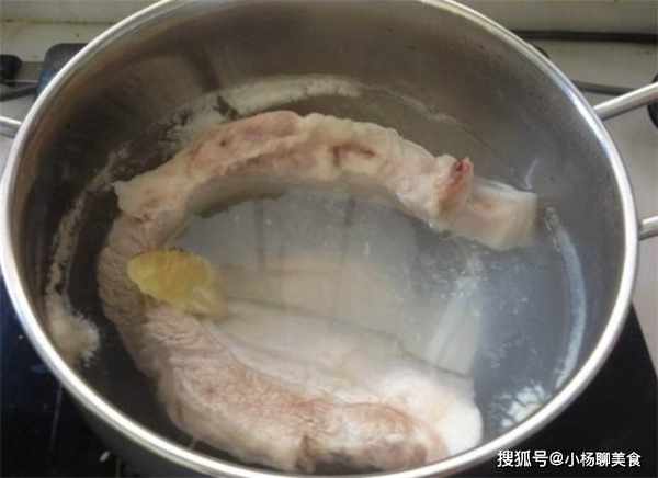 第一步:先將整塊的五花肉用清水浸泡一個小時,然後放入鍋中,下入生薑、白酒,大火煮開,轉成小火煮8分鐘,把五花肉中的血水都煮出來以後,接著過一遍凉水即可。