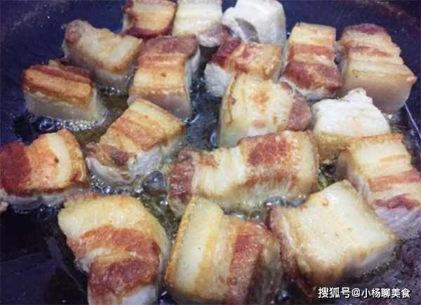 第二步:把煮好的五花肉切成3釐米左右的方塊,起鍋燒油,油熱以後,下入五花肉,用小火炸制肉塊表面金黃,撈出控幹油備用。