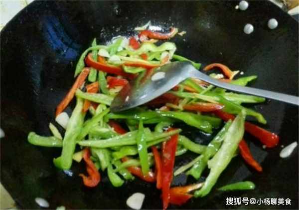 3、起鍋燒油,保證熱鍋冷油,油溫7成熱時下入青紅辣椒絲,大火爆炒到7成熟,加入少量食鹽調味,即可起鍋。