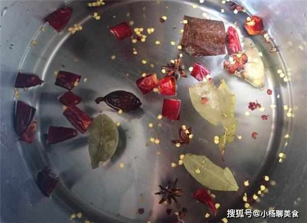 2、起鍋燒水,把八角、香葉、幹辣椒、花椒、生薑片冷水入鍋,並加入少許食鹽,大火燒開後轉小火煮10分鐘,關火後使料汁自然冷卻,並加入少許高度白酒和白醋。