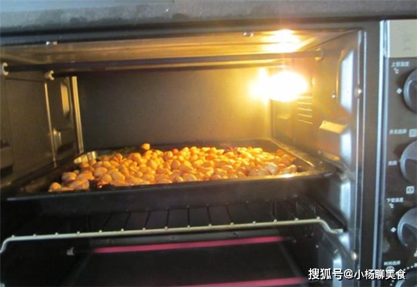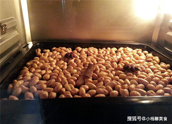 4、把泡好的花生瀝幹水,放入烤箱的託盤中,花生表面撒適量的食鹽,大約20克即可。因為料汁已經使花生入味,撒鹽過多花生太鹹就難以下咽了。託盤放入烤箱中,上下溫200度,先烤15分鐘,再調溫至180度,烤20分鐘即可。取出晾凉即可食用。