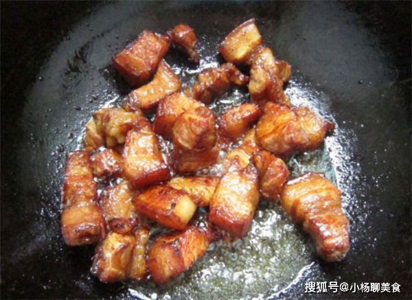 5、五花肉上完色,倒入適量的花雕酒,剛好沒過肉塊即可,然後放入八角和香葉,還可以加少許醬油提色,然後放少許食鹽調味。蓋上鍋蓋,用小火燜煮35-40分鐘的時間,然後放入炸過的鵪鶉蛋,翻炒均勻,大火收汁即可。