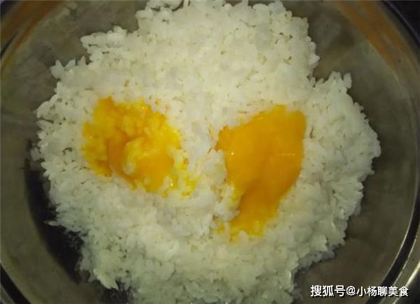 1、把雞蛋的蛋白和蛋黃分離開,把隔夜米飯盛入碗中,帶上手套捏散,然後把蛋黃倒入米飯上,帶上手套攪拌均勻,讓蛋黃均勻的裹在每一粒米飯上。