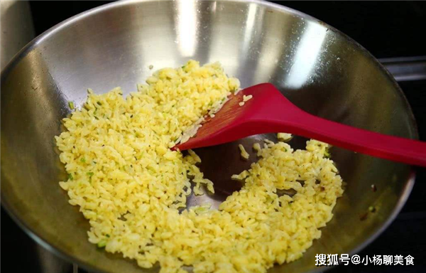 3、炒裹有蛋黃的米飯時一定要用大火,油要熱,這樣可以把米飯均勻炒散,做到粒粒分明,小火凉油炒不出這樣的效果,而且可能炒出來有蛋腥味,這一點要謹記。