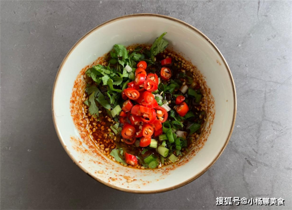 1、把小米辣、蒜末倒入碗中,加入蔥花、熟芝麻,然後倒入辣椒片和辣椒面,起鍋把油燒熱,當油開始冒煙後關火,先將一半油淋入辣椒面中,攪拌均勻,然後加一勺香醋,攪拌均勻,接著把剩餘的熱油倒入碗中。