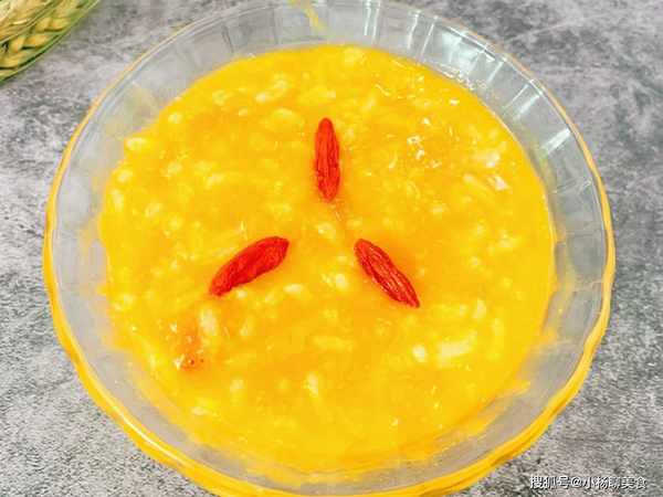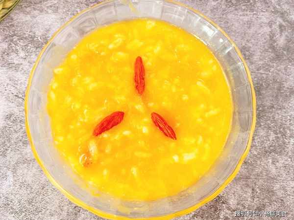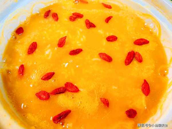 食材準備:南瓜500克、大米100克、冰糖15克、枸杞3克、水適量。