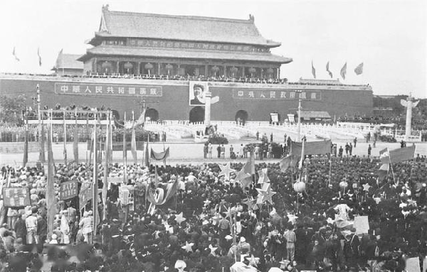 1949年10月1日下午三點,中華人民共和國舉行開國大典。毛澤東在北京天安門城樓上宣讀了《中華人民共和國中央人民政府公告》,莊嚴宣告中華人民共和國中央人民政府成立。