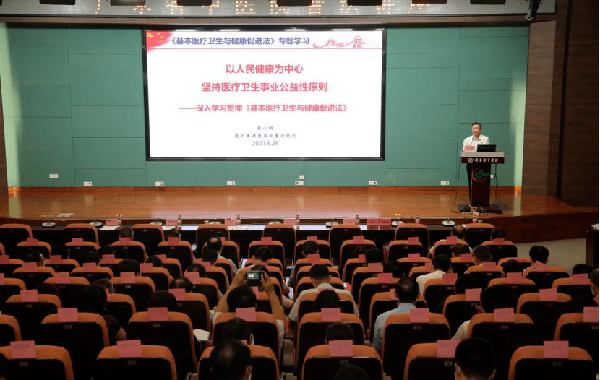 張心明以《以人民健康為中心堅持醫療衛生事業公益性原則》為主題,運用過硬的專業知識和深入淺出的語言,圍繞《基本醫療衛生與健康促進法》的基本內容,結合工作實際,分別從《基本醫療衛生與健康促進法》立法的重要意義、框架內容和落實醫療衛生事業公益性原則的相關規定要求等三方面進行了解讀。