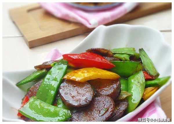 2、炒鍋倒油,炒香蒜和葱,倒放荷蘭豆彩椒大火炒至半熟。