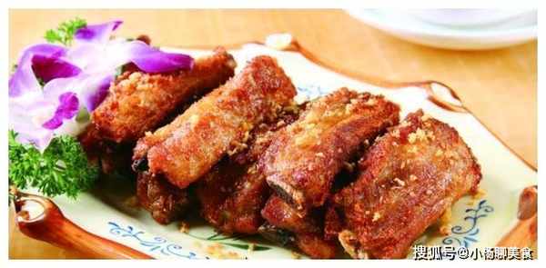 2.大蒜切蒜蓉備用。鍋裏放入能沒過排骨的油,油溫到伸筷子進去有冒小泡就下排骨炸,炸熟外表金黃就撈出。